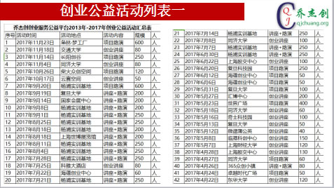 2、2018年乔杰创将举办50多场(平均200人/场)线下免费的创业公益讲座和项目路演等创业公益活动,继续走进上海及周边的各大高校校区、创业园区和街道社区;预计每个季度将举办一次500人/场的大型创业高峰论坛;另外还将协办和支持50多场其它的创业公益活动,全年线下创业公益活动高达100多场。